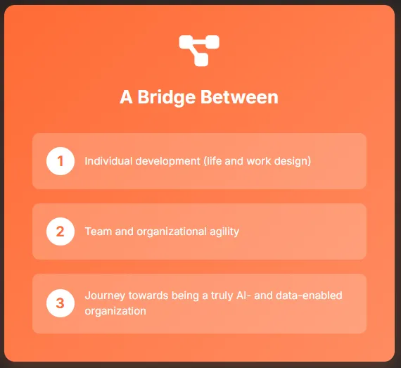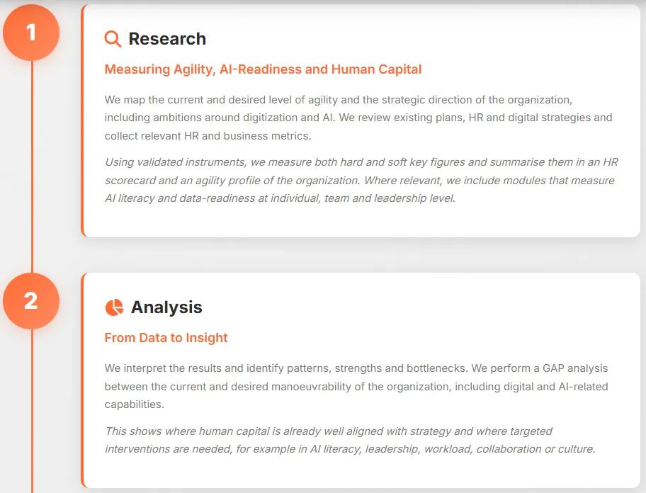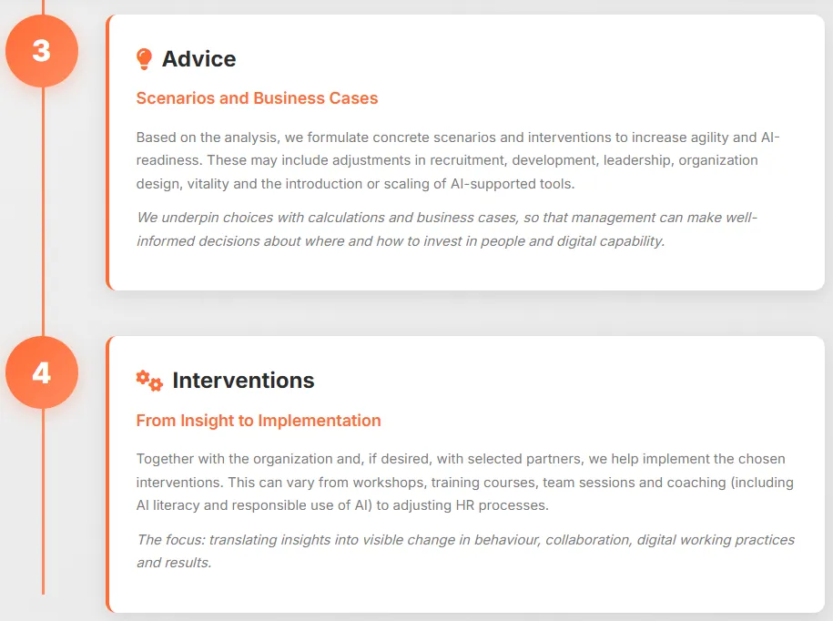 The method can be used as a stand-alone trajectory (for example as a QuickScan) or as the foundation for broader programs in employability, leadership, AI literacy and maturity, learning & development and organizational design.