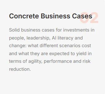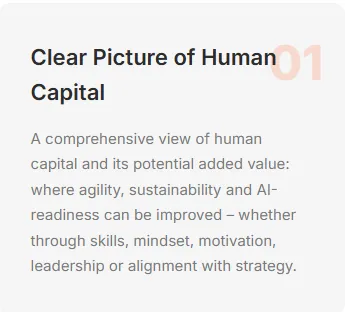 Human Capital Metrics is designed to work with digital platforms and AI-enabled analytics where this adds value. Scorecards and profiles can be integrated into dashboards, HR systems and learning environments, giving leaders and HR real-time insight into trends and risks.
